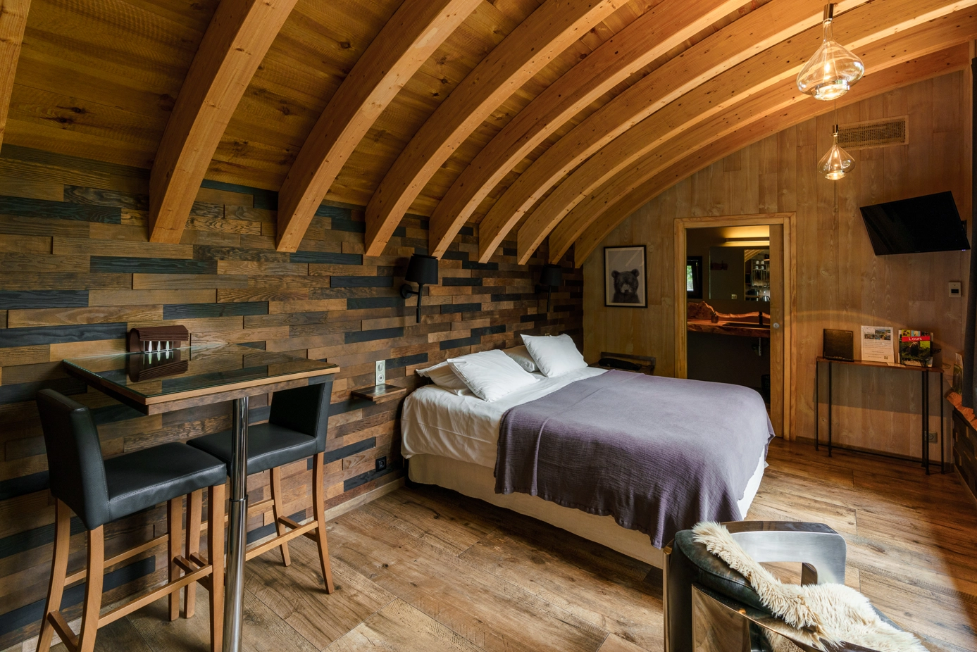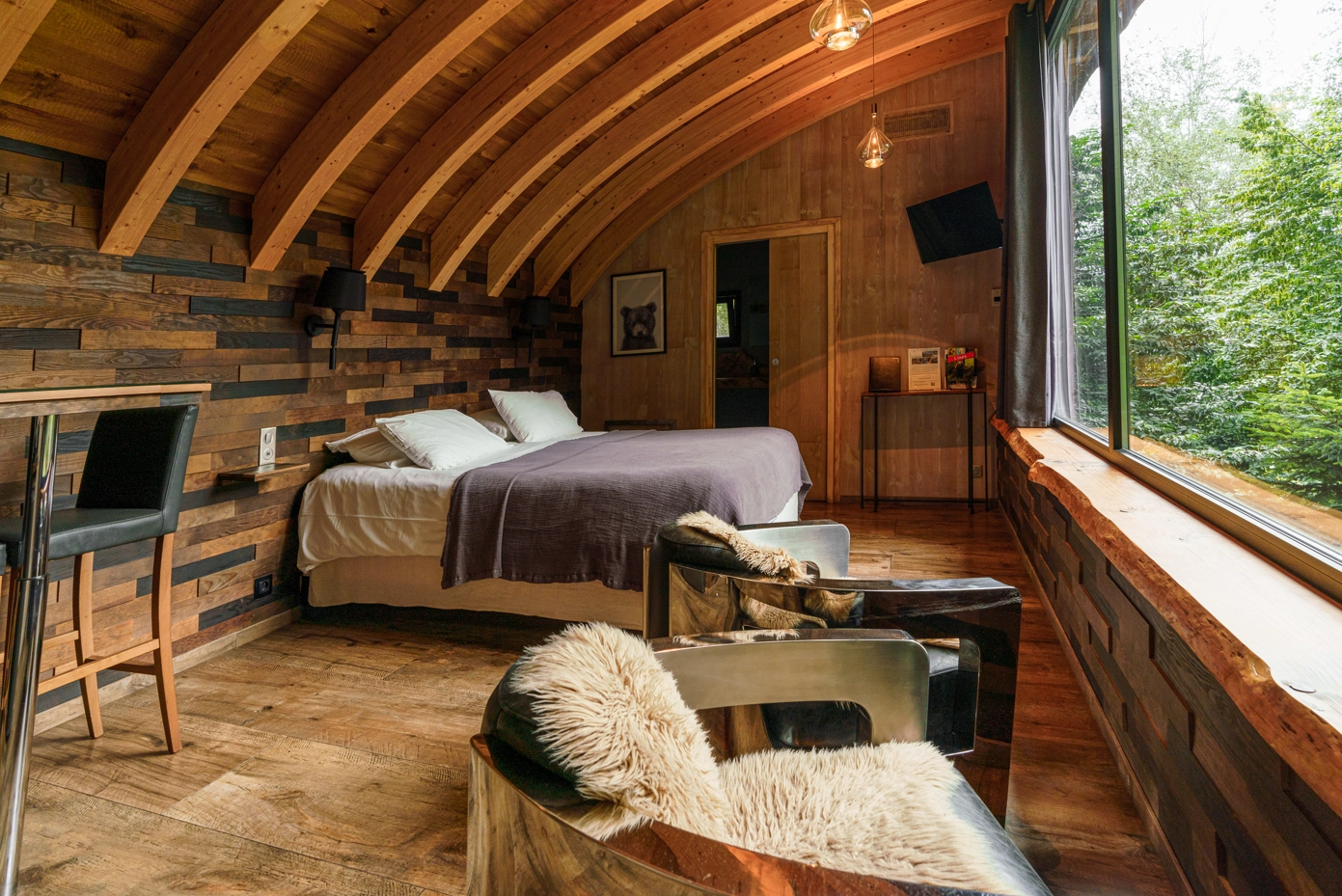 Splendide cabane en forme de dôme, surplombant l'enclos des Ours Bruns, ce logement créé pour 2 personnes vous fait vivre un moment très intimiste. De standing haut de gamme avec un lit king size, une salle de bain tout confort, une décoration chaleureuse et cocooning, le point de vue est imprenable sur l'enclos de nos trois ours. Micha, Trona et Indu jouent et évoluent sous vos yeux, pour votre plus grand plaisir. Le temps d'une nuit, entrez dans la vie du Seigneur des Pyrénées, et admirez ce majestueux animal qu'il est indispensable de protéger.